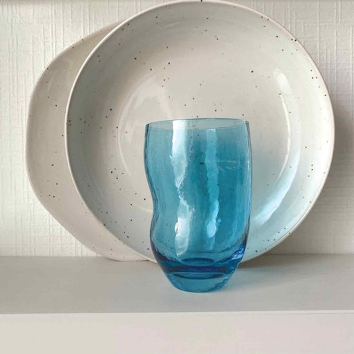 يضفي الزجاج ذو التصميم العضوي واللمسة النهائية المطروقة جواً عصرياً وهادئاً على مائدتك.