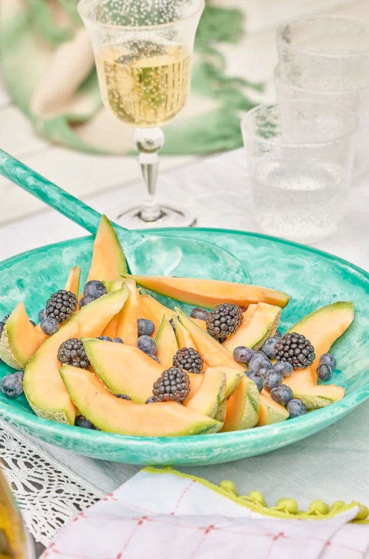Gorgeous, large salad bowl in soft green resin with a lovely white pattern. The pattern is hand poured, so you will never find two completely identical bowls, which we think is so charming. Use it for anything... for a salad, for kneading a dough... or perhaps to store some of your belongings.