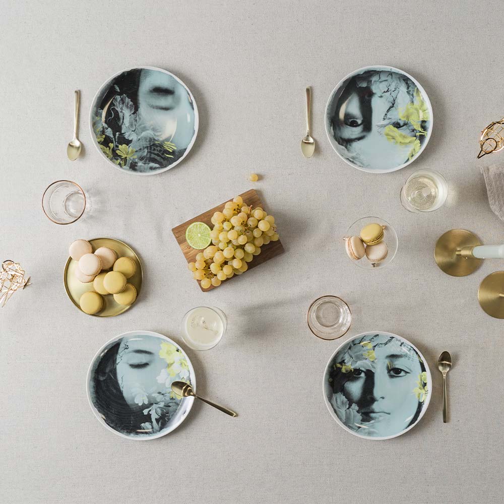 This set of 4 plates in 21 cm porcelain enriches the art of the table with an approach where design meets refinement. From the graphic universe of Rachel Convers, these plates feature three different design: Alhambra, inspired by the architectural and floral richness of the palace in Granada; Osorio, which evokes the nostalgia of a Portuguese palace with refined azulejos; and River, which echoes the softness of a love story carried by the movement of water. Designed to accompany the 27 cm plates, these pieces add a decorative and narrative dimension to any meal. Model Alhambra, Osorio, River