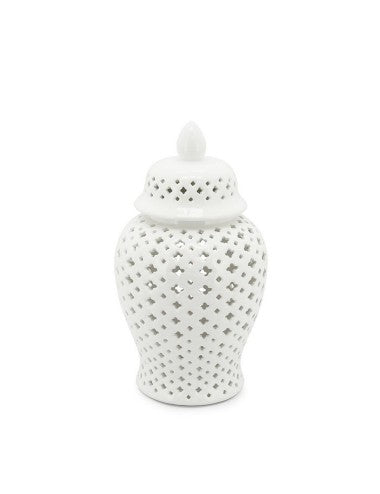 The vase Ming Cross made of ceramic and is entirely hand-pierced, its surface reflects light subtly, creating a play of shadows that adds depth and character to your room.