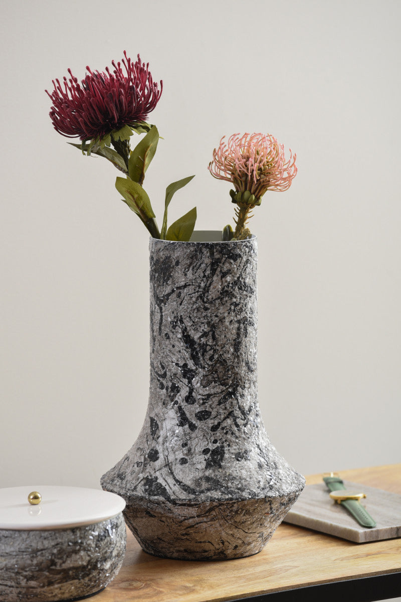 Mosaic Marble vase - handmade This elegant vase from Present Time is a true statement piece. Made of iron and finished with a subtle glass mosaic that provides a sophisticated sheen. The marble look adds an artistic and luxurious effect to any interior.