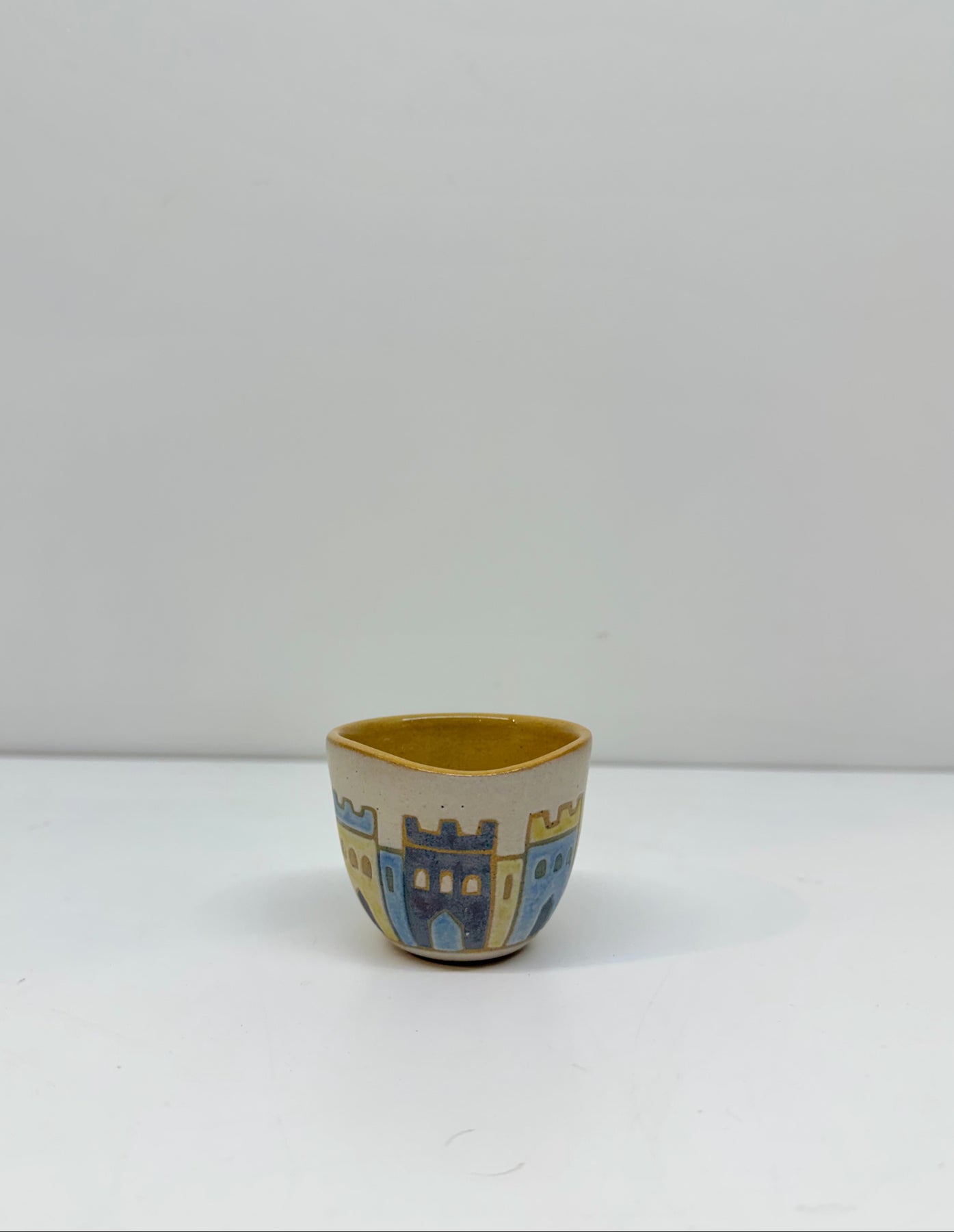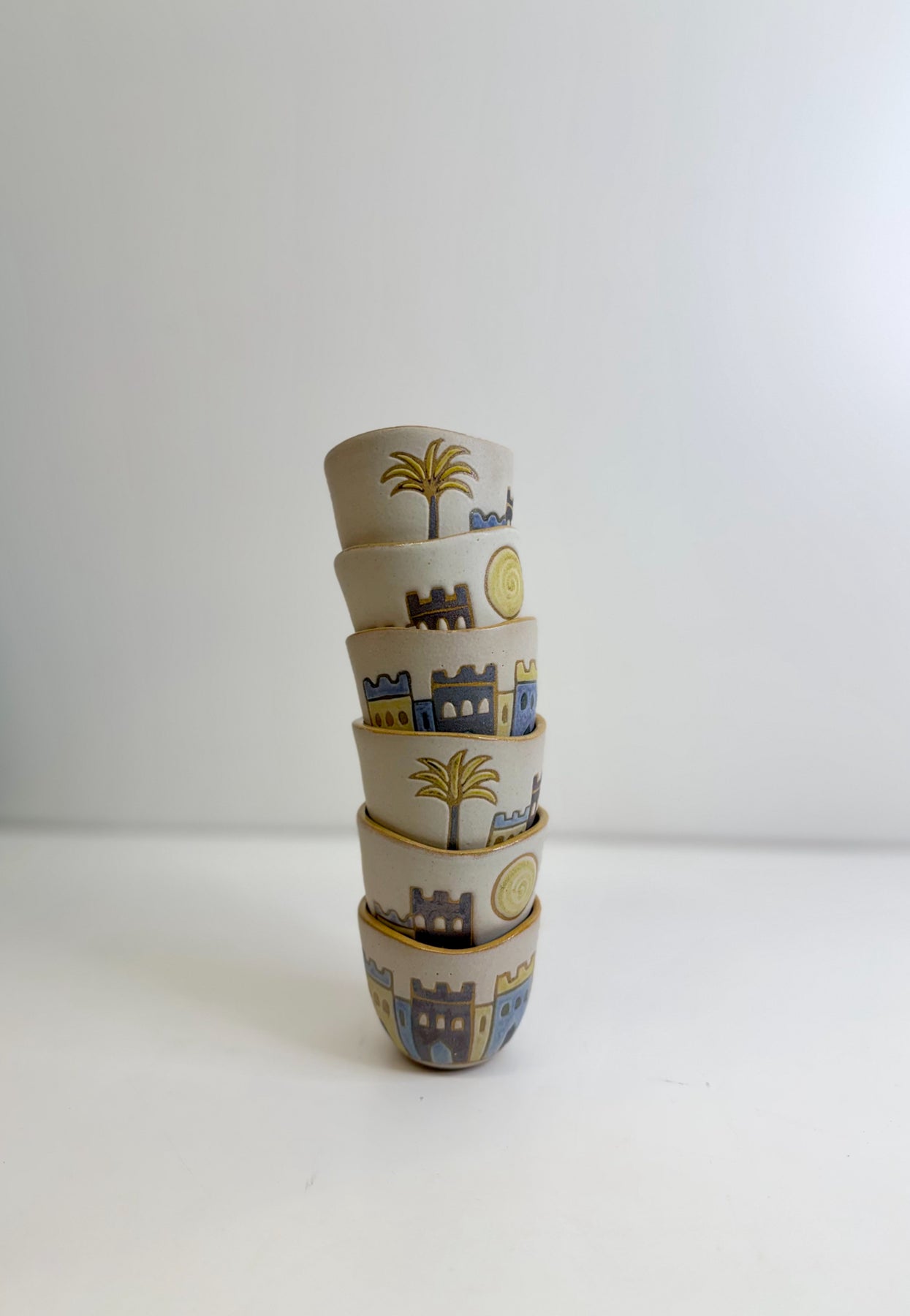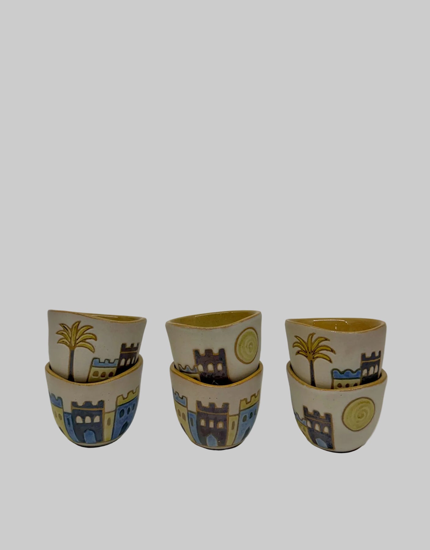 طقم قهوة سعودي ابيض فخار   رسم يدوي النخلة و كرمها  والبيوت القديمة و دمج  والكرم والفن  دمج الآوان مابين الأزرق الفاتح والأصفر والترابي  يجعلك تشعر بالبهجة شغل يدوي كله حب واتقان