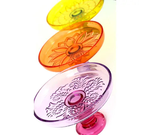 - **تصميم فريد:** ثلاث كؤوس زجاجية ملونة: البنفسجي والأصفر والبرتقالي.
