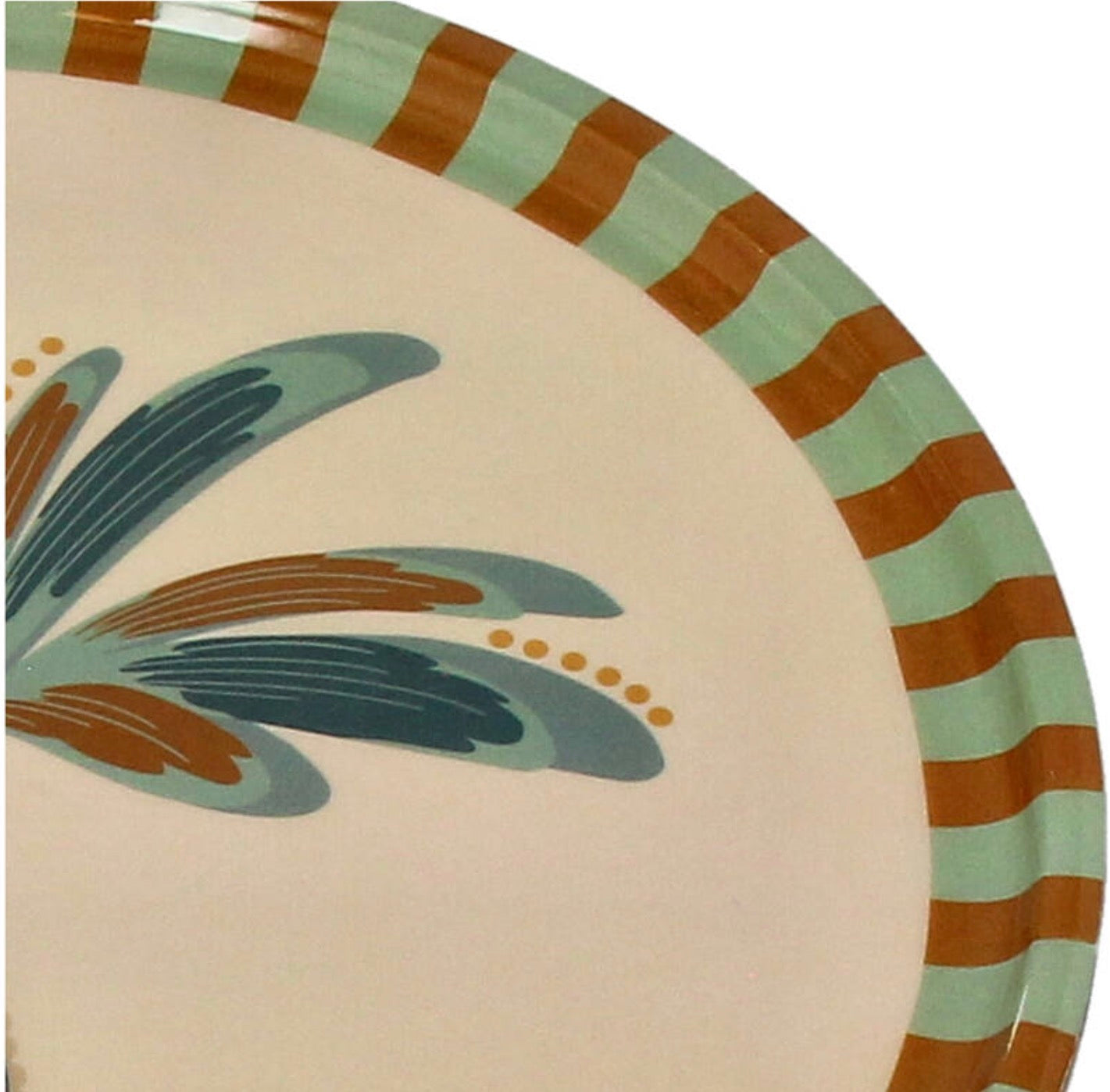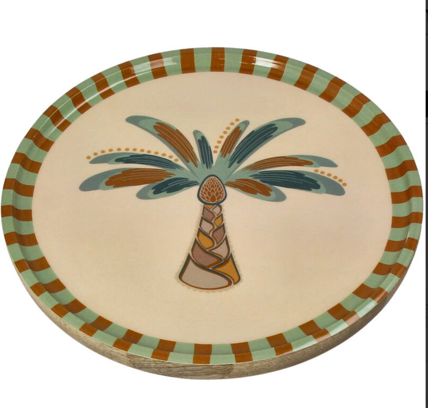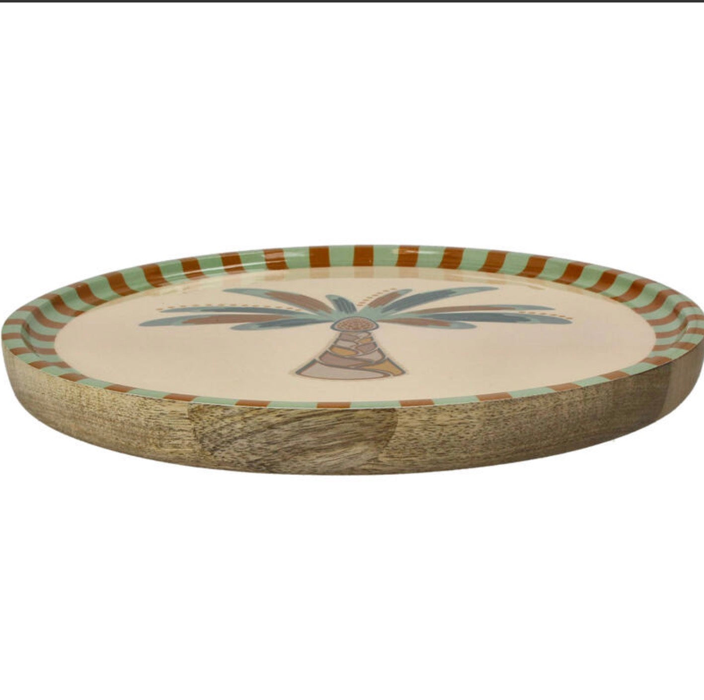A mango wood board with a palm tree design, perfect for a tropical and exotic look.