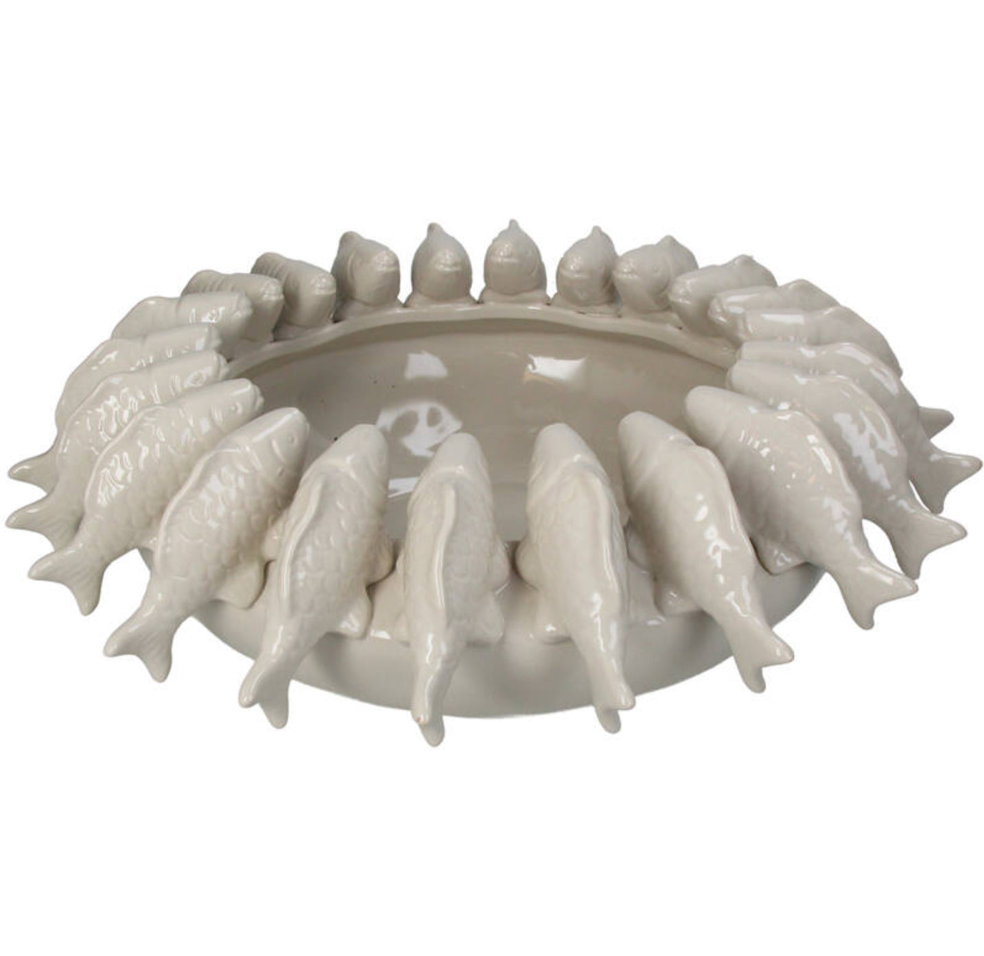 An ivory-colored stoneware bowl with fish motif measuring 37.5x37.5x15cm, perfect for a maritime and refined look.
