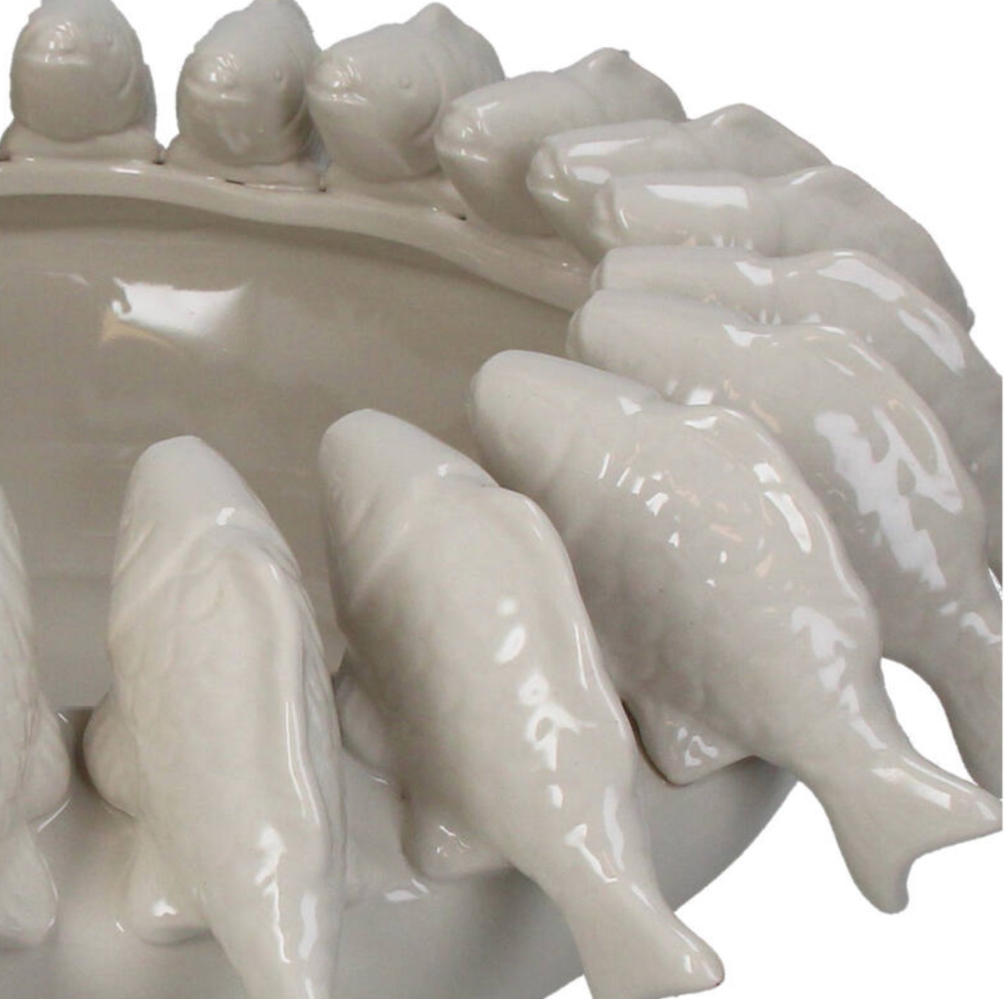 وعاء من الفخار العاجي اللون مزين بنقشة سمكة، أبعاده 37.5×37.5×15 سم، مثالي لإطلالة بحرية راقية.