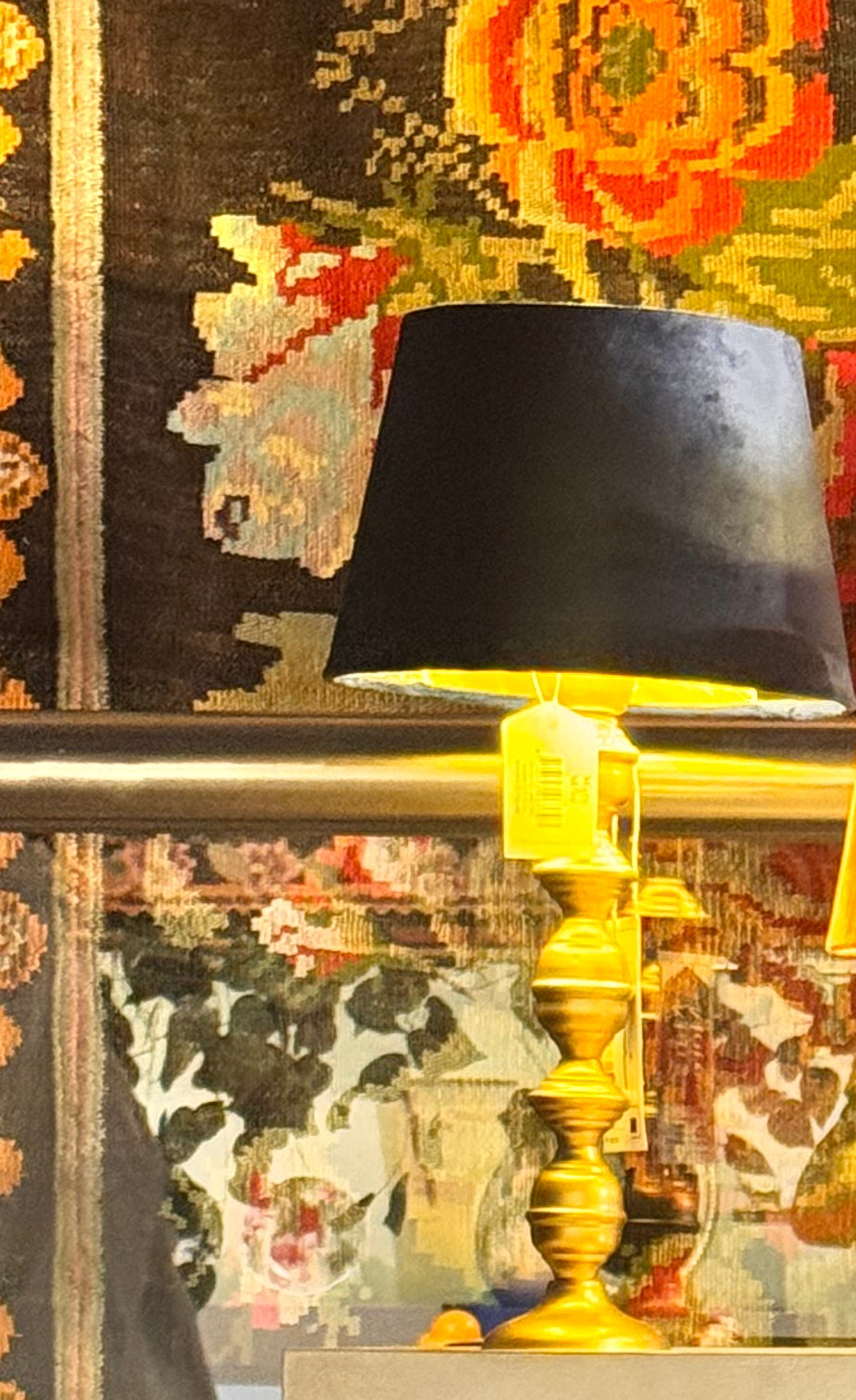 اضاءة طاولة خشب ذهبي مع غطاء مخمل ازرق غامق