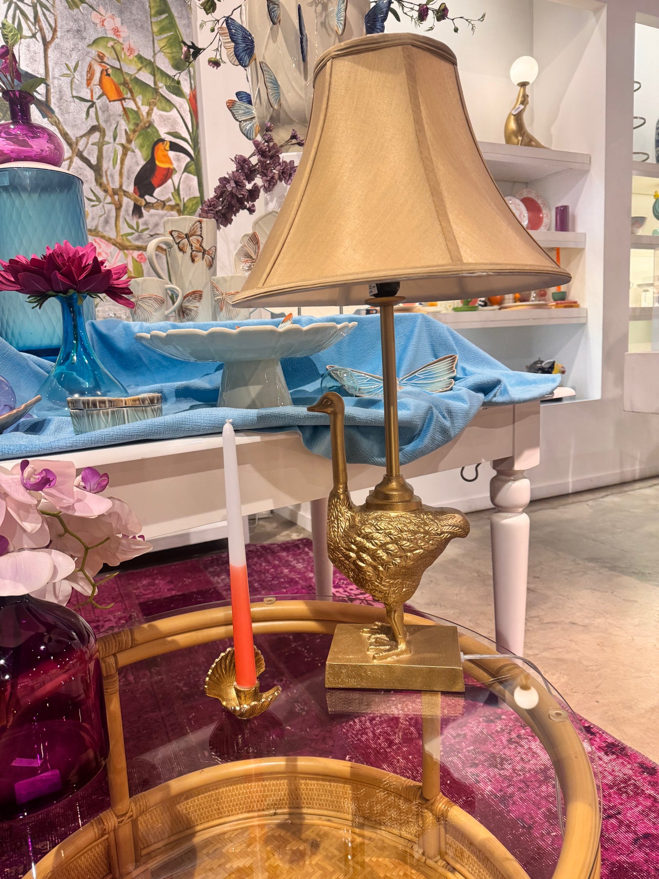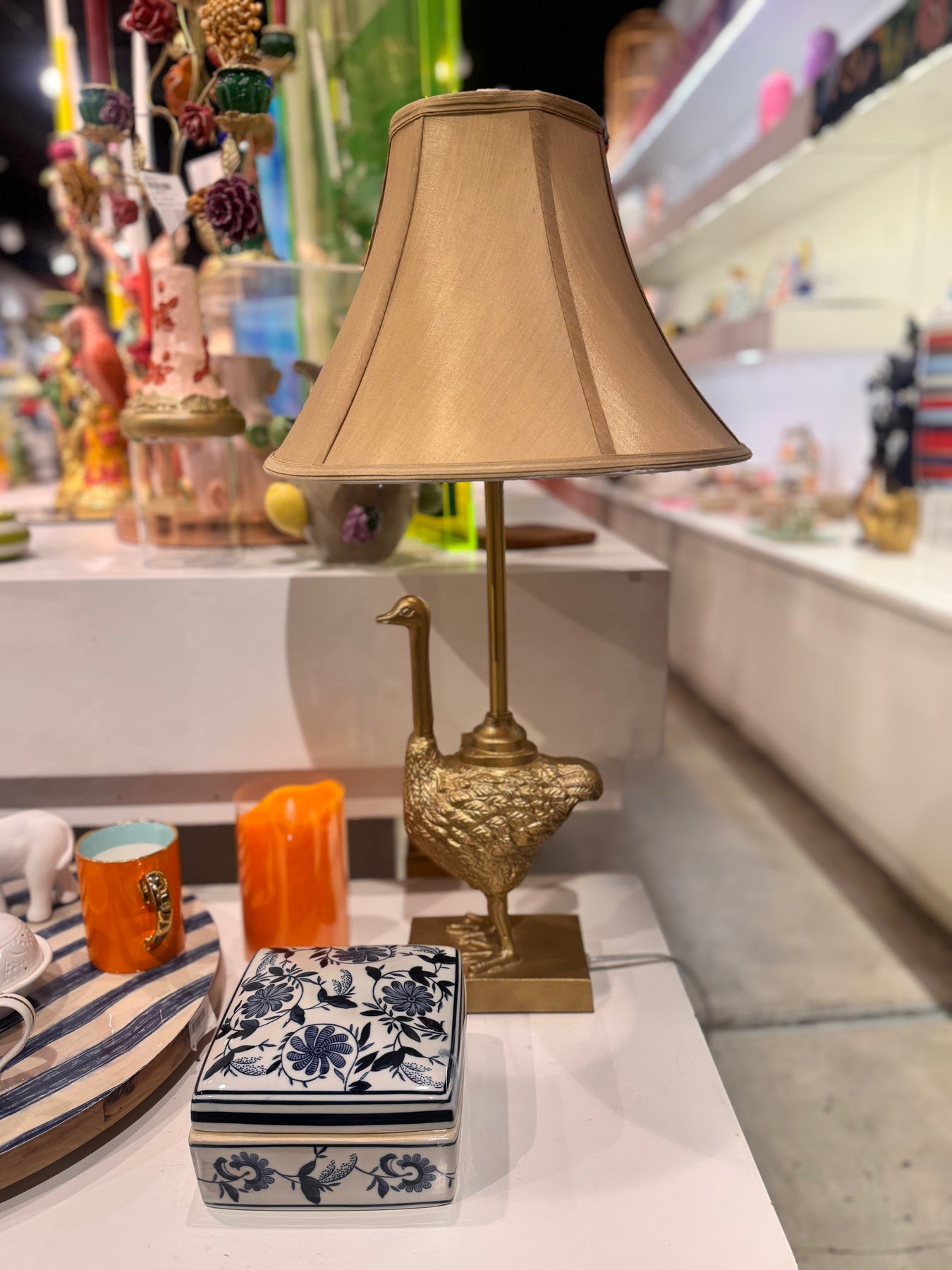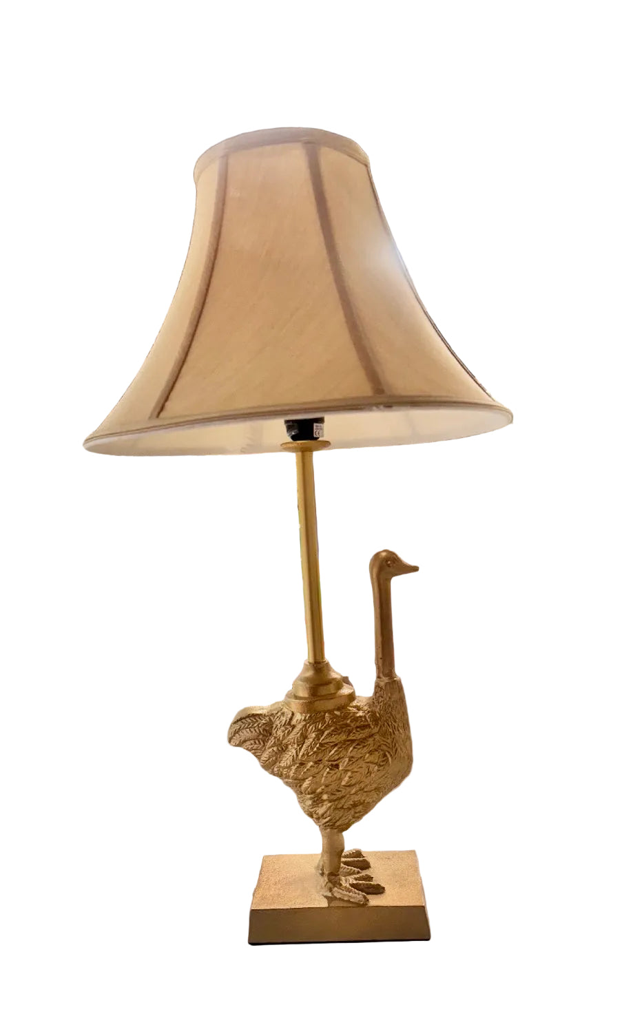 Funky gold metal table lamp in ostrich shape… This gold lamp will for sure stand out in your living room and steal your guest's attention when they visit you. A fun and funky lamp that will light up any home! . This lamp comes with an E27 socket and a two-prong plug with round prongs. Max 40W.