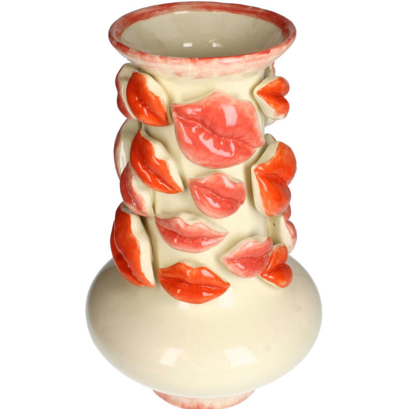 A playful, creamy vase adorned with prominent red lips on all sides. An eye-catching piece of art, perfect for flowers or as a standalone art piece.