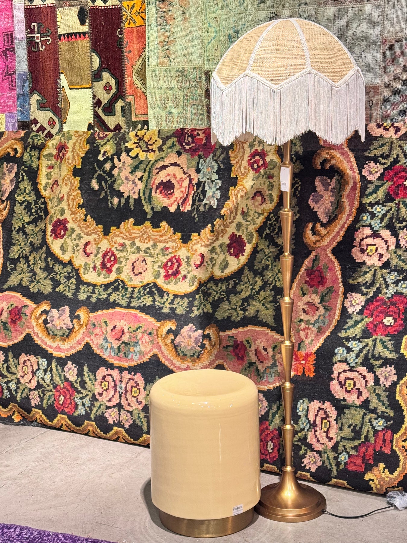 مصباح أرضي من بوتيا، قطره ٢٥ سم وعرضه ١٣٤.٥ سم، لون برونزي عتيق، مع راتان مع خيوط حرير